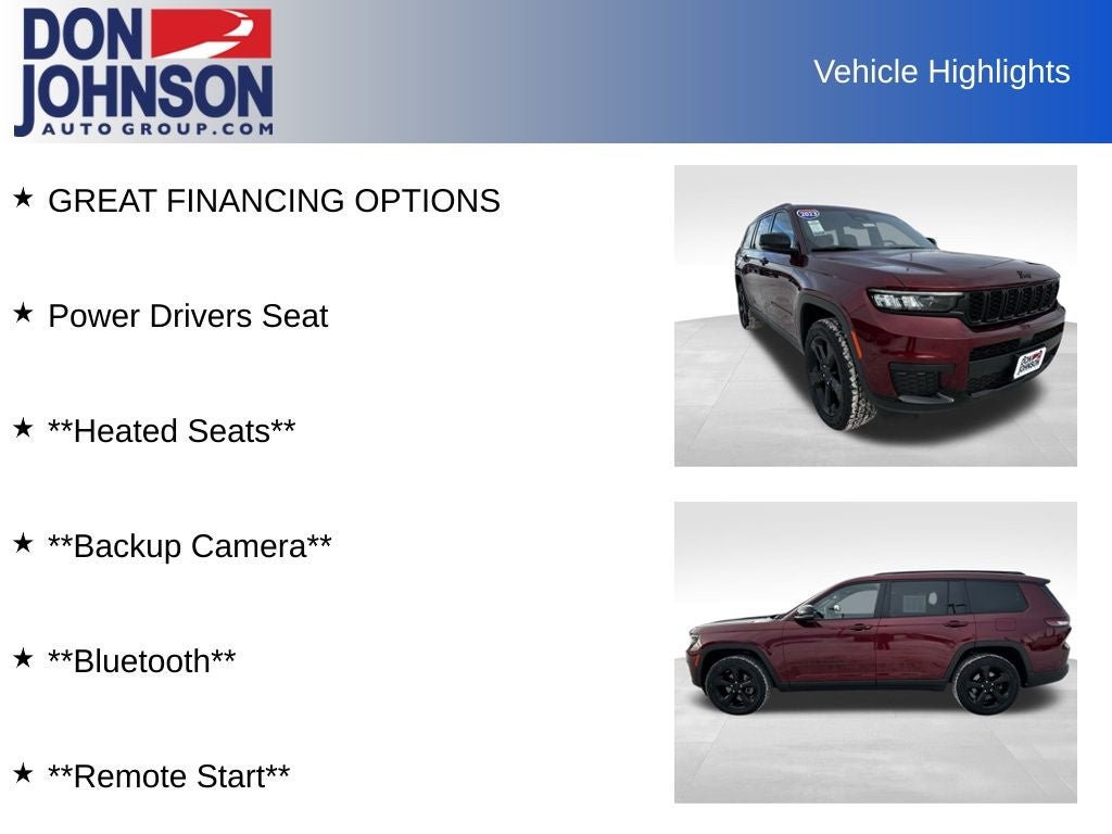 With its impressive capabilities, premium features, and exceptional condition, this 2023 Jeep Grand Cherokee L Altitude is an exceptional value at just $31,000. Don't miss your chance to experience the ultimate in SUV luxury and capability.